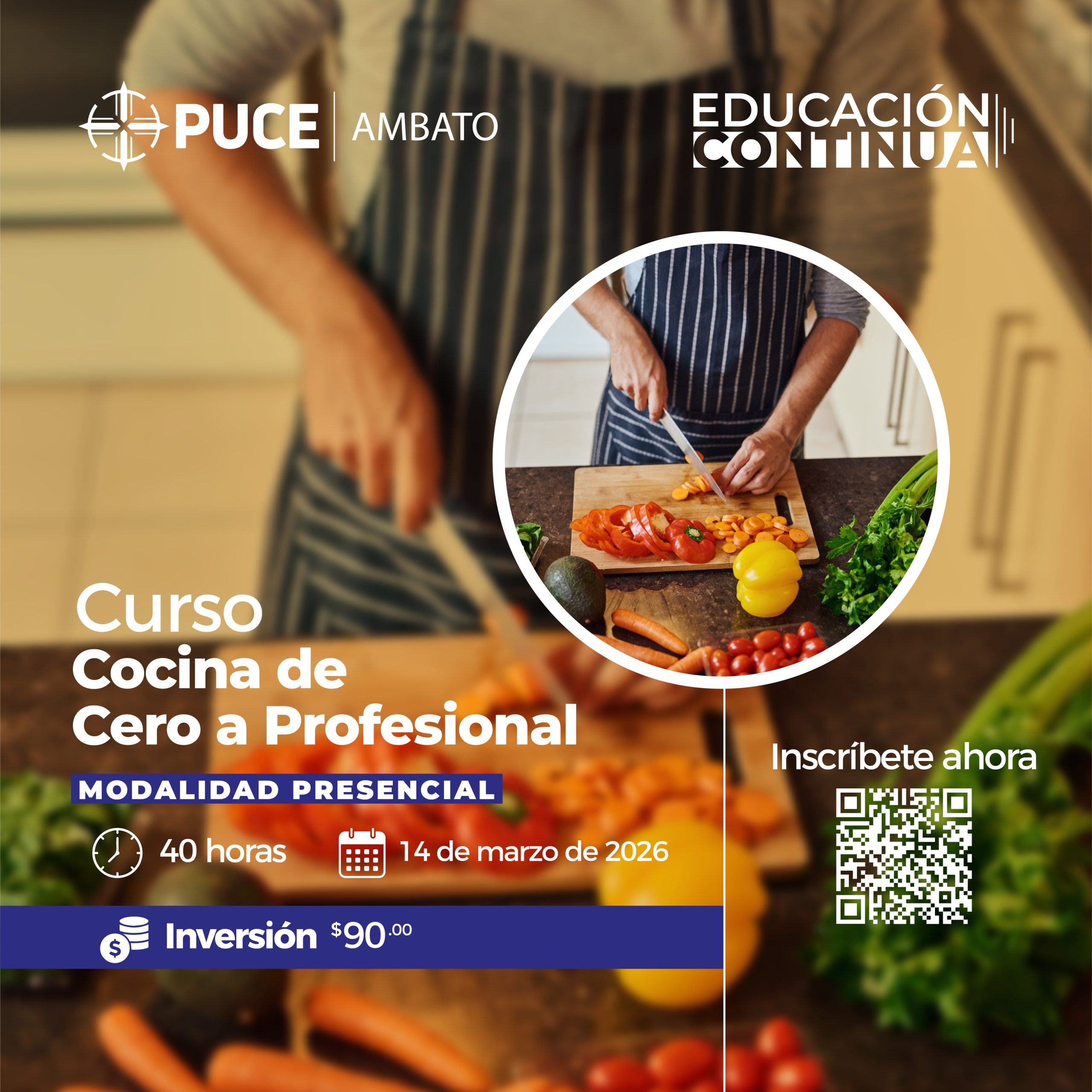 Cocina de Cero a Profesional publicado por PUCE Ambato Categorías CURSOS Fecha 30 agosto, 2024 Fechas Inicio: 14 de marzo de 2026. Finalización: 18 de abril de 2026. Inscripciones Hasta el 14 de marzo de 2026. MODALIDADPresencialDURACIÓN40 horasDeseo inscribirmeINVERSIÓNINVERSIÓN 90 USD Formas de pago: Tarjeta de Crédito/Débito, Transferencia o Pago en Línea Compartir: PUCE Ambato Publicación anterior Excel Intermedio y Avanzado con IA 30 agosto, 2024 Siguiente publicación De la idea al Paper: Guía completa para la Escritura Académica 8 octubre, 2024 También te puede interesar Ensamblaje, mantenimiento y soporte técnico especializado en Computadores 2 febrero, 2026 Prevención de riesgos Ergonómicos en el trabajo 26 julio, 2024 Gestión Directiva en Economía Popular y Solidaria 15 julio, 2024
